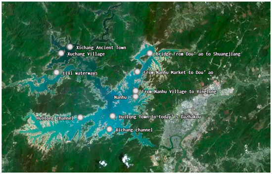 In this survey, we completed the sonar investigation of more than 70 km2 of water areas. The exact locations of the five ancient towns of Nanhu, Huilong, Xichang, Lixi, and Guling were basically identified. In addition, the distributions of the specific river network of the upper reaches of the former Xinfeng River, Guangdong–Jiangxi Ancient Post Road in the inundated area, and trading route within the area were also basically confirmed (Figure 2). Location of each archaeological object is denoted on the map using the GPS coordinates (Figure 3).