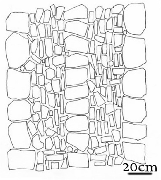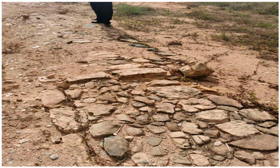 The ancient road In Xiaodong Village Is 1 m to 1.2 m wide, with a residual length of approximately 80 m, and the road surface is paved by smaller stones in a certain stepped shape. The road surface is poorly preserved, with varying degrees of tilting, missing, and burying (Figure 8).
