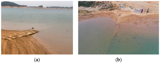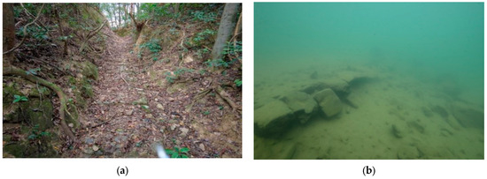 Comparison of uninundated and submerged parts of Dou’ao Ancient Road. (a) The well-preserved Dou’ao Ancient Road, and (b) the remaining underwater Dou’ao Ancient Road.