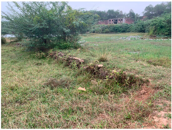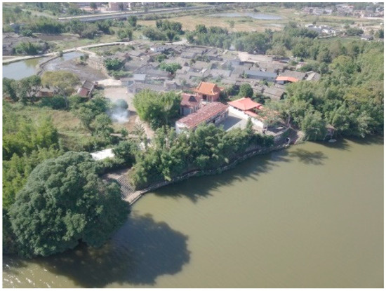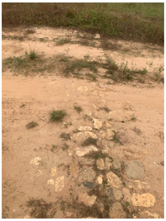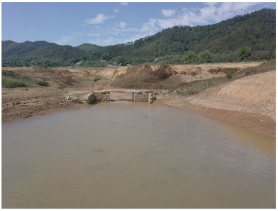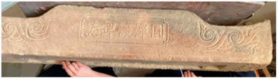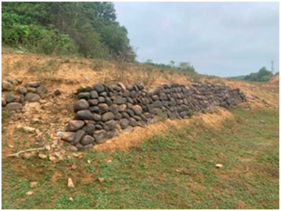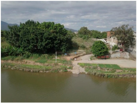 In Xialin Village of Shuangjiang Town7, the remains of a linear ancient road was found in front of the Huang Family’s Ancestral Hall, which was flooded during the period of abundant water. It extends from the front of the Huang Family’s Ancestral Hall to the river, lying 30 cm to 50 cm high above the current road surface and with a width of 1 m to 1.2 m and a residual length of approximately 50 m. The road features an elevated roadbed with a pavement of cladding stones. Although its preservation is acceptable, there are noticeable gaps in the paving stones, while the cladding stones on both sides remain relatively well preserved (Figure 9).
