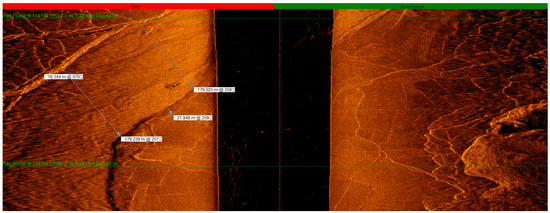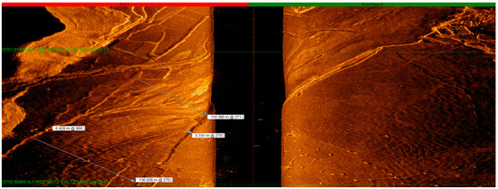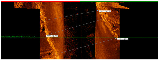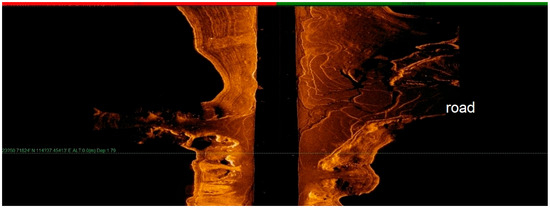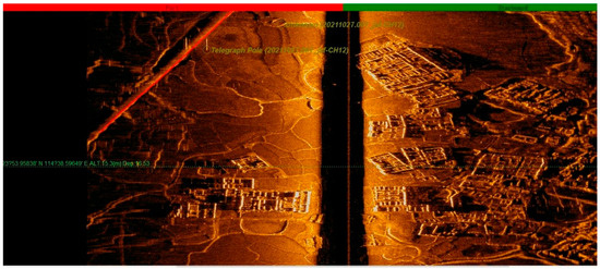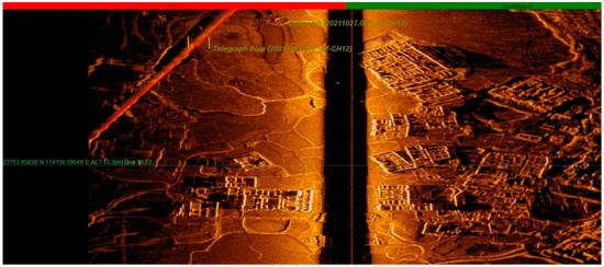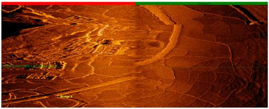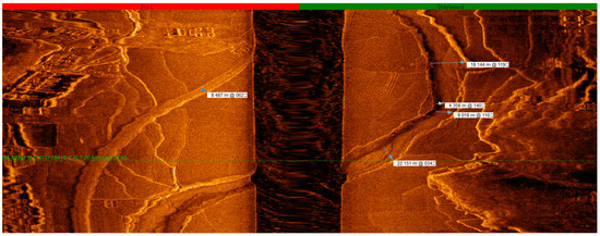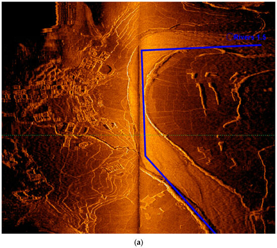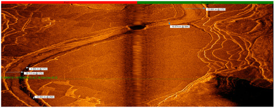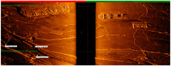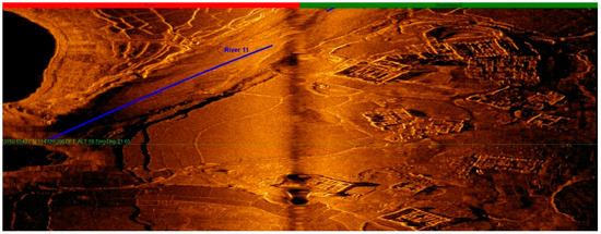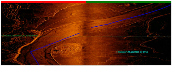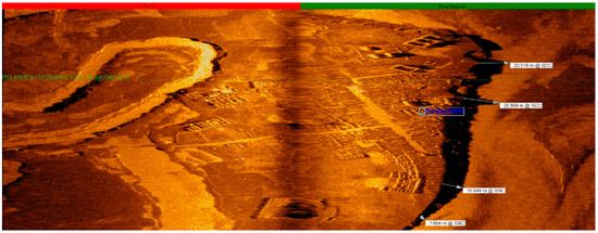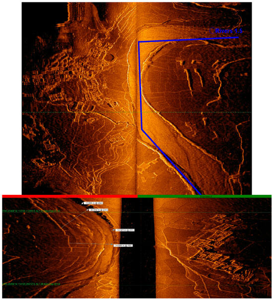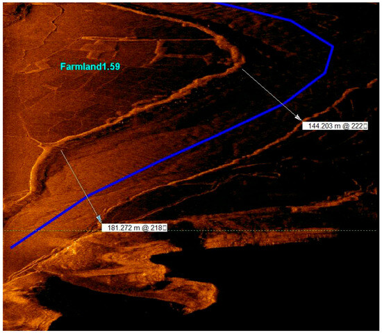 With real-time monitoring of the site investigating graphics, the emergence of underwater artificial remains (farmland, orchards, tea gardens, isolated buildings, villages, and ancient towns composed of groups of ancient buildings) were marked on a regional map in a timely manner with screenshot records. During the detection phase, with reference to the regional map, underwater continuous survey lines, and coherent remains (rivers, paddy fields, and ancient roads), we adjusted the ship’s survey course in a timely manner. In addition, in data processing, we compared the regional map with site records, played back the swept graphics, and put together the distribution maps of the remains in a wider range. For special remains, we displayed vector graphics by selecting the points to obtain detailed data information, including coordinates, depth, widths of the remains, and their estimated heights [4,5].