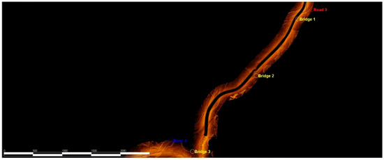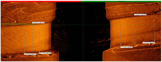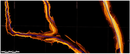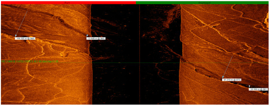 From the sonar map, the water network within the inundation zone of the Xinfengjiang Reservoir appears intricate, with numerous small tributaries running down from the mountains in the river-valley region. These tributaries merge into the Nanhu, Guling, and Lixi waterways before eventually converging back into the Xinfeng River. Near the point where the Nanhu waterways merge with the Xinfeng River’s main channel, the Nanhu waterways reach a maximum width of more than 181 m, as indicated by the sonar-map measurements (Figure 11, Figure 12, Figure 13, Figure 14, Figure 15, Figure 16, Figure 17, Figure 18, Figure 19, Figure 20, Figure 21, Figure 22 and Figure 23).
