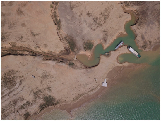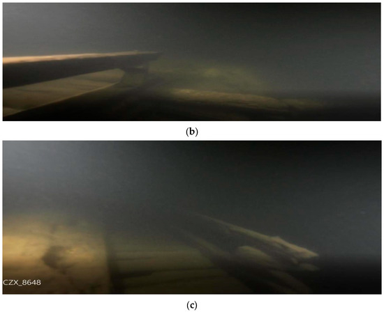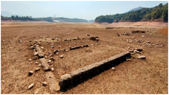 The Dou’ao Ancient Road4 is located in Doubei Village of Xingang Town. It is approximately 0.57 km long and 1.8 m wide, paved with rubble, and it features steep slopes in a stepped pattern and an overall north–south direction. In 2018, it was restored as a key construction section of the ancient post roads in Guangdong. Following the Dou’ao ancient road and navigating the mountains from north to south, one will reach the edge of Wanlv Lake. In the once-submerged area, the underwater part of the Dou’ao Ancient Road was found to be connected to the southern end of the ancient road, with remnants of the linear ancient road extending all the way into the lake. The road-surface condition was poorly preserved, with many tilted pavements and crippled road surfaces. A complete ground surface appears where the ancient road enters the water and continues into the lake (Figure 5).