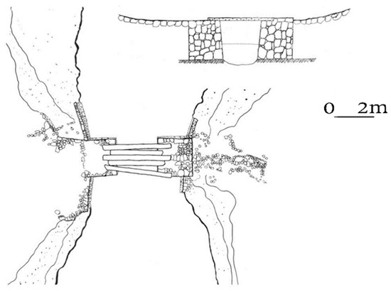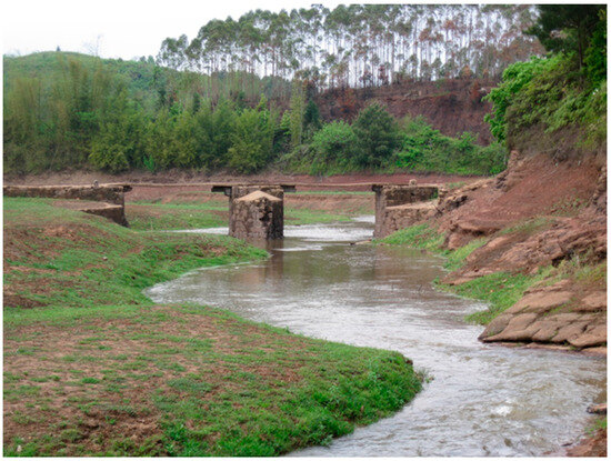 The Xialin Stone Bridge is located east of Xialin Village, Shuangjiang Town, Dongyuan County, and it was revealed after the water level dropped. The Xialin Stone Bridge, which spans a tributary of the Zhongxin River, is a girder bridge with three piers. The piers were constructed with stone. The upstream side of the piers features a boat-resembling sharp shape. Stone slabs are laid horizontally to form the bridge surface, and all piers stand 3 m apart. Two layers of cantilevers are arranged on both sides of the central pier along the direction of the bridge, and one level of cantilever is added to each of the piers on the ends toward the center of the bridge to shorten the span of the bridge and enhance the bearing capacity of the bridge surface (Figure 42).