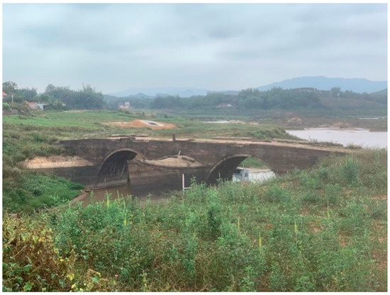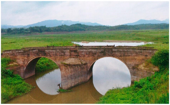 Yongding Bridge is located in Dongba Village, Jiantou Town, Dongyuan County. It was first built in the second year of the Daoguang reign in the Qing Dynasty (1822) and was completed in the fifth year of the Daoguang reign (1825). Running east–west, it is a double-arched stone bridge and has been revealed since the water level dropped. The bridge is 53 m long and 6.95 m wide. The piers and main parts are made of granite slabs with boat-shaped diversion tips. A red-sandstone bridge surface, railings, and balusters with lotus-flower decorations are seen on the bridge. The railings have collapsed due to the impact of water. Some have fallen on the bridge surface or diversion tips of the piers, while some have fallen into the river. In 2011, Yongding Bridge was accredited as a protected cultural relic of Heyuan (Figure 43).