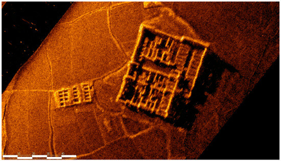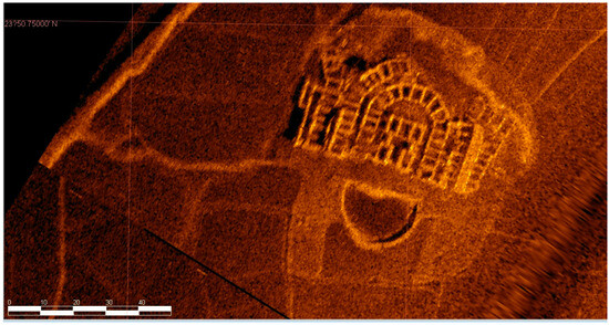 From the sonar-detection imagery, we can find that many Hakka-enclosed compounds and sijiaolou buildings existed in the submerged towns and villages. From the sonar imagery, we can identify the iconic half-moon-shaped ponds in front of the enclosed compounds [7], oblong enclosures, and well-organized rooms (Figure 52). Unfortunately, most of the buildings are only left with walls or wall foundations as their roofs are all gone (Figure 53).
