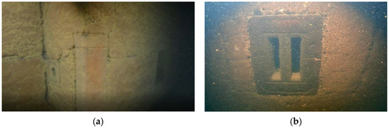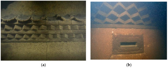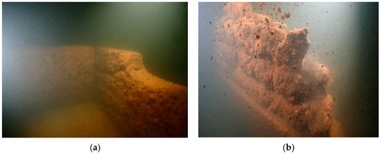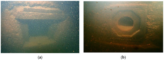 The villages and market towns are dotted with many Hakka sijiaolou buildings. Initial findings from sonar detection showed that certain parts of the walls were preserved. Thus, we arranged for underwater archaeologists to dive into the water for further examination. Through the underwater survey, we found that the roofs of most of the sijiaolou buildings were demolished (Figure 54). Because the walls were mostly made of rammed gray sand with higher solidness, some were retained. From the remnants of these walls, we can see that the original building had wainscoting made of rock slabs. The walls had several defensive gunshot and ventilation holes, and the four corners of each building were all tilted (Figure 55, Figure 56 and Figure 57). These were all iconic features of a typical Hakka sijiaolou building [8]. These Hakka dwellings with sijiaolou towers are different from the surrounding Hakka dwellings in Meizhou, Ganzhou, and Longyan [4]. They carry the typical features of Hakka architecture along the Dongjiang River, and once again demonstrate that the customs of the Hakka people near the Dongjiang River are distinct from their counterparts in neighboring areas. This is closely related to the commercial development in the area and need to store goods, displaying a strong geographical feature.