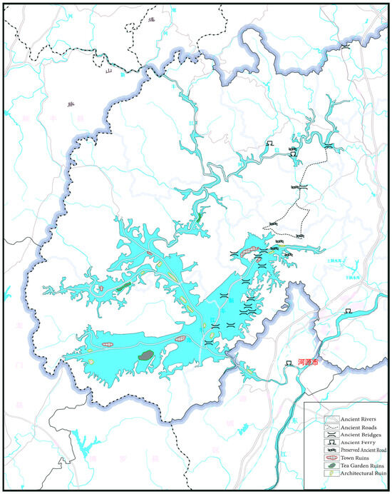 A map showing the distribution of ancient ruins submerged in Wanlv Lake.