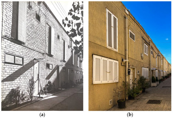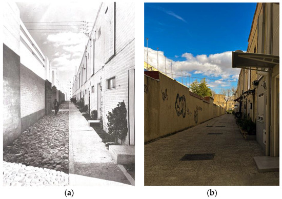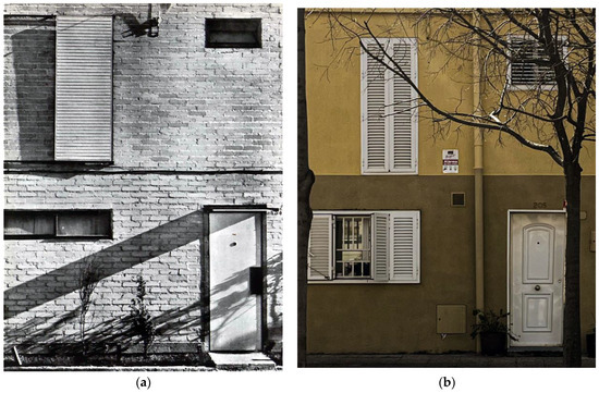 - Case 2 (Figure 8): As in the previous case, the reform of the 1990s put an end to the strips intended for vegetation growth. This timid boundary, moreover, provided the inhabitants with a brief home extension, increasing the few square meters that had been available for building, given the rigors of the budget. In addition, the sliding shutters provided a factor of variety, which, together with the climbing plants, favored the vitalist image of these serial facades: “this eagerness to make such hard architecture a friendly place” [37] (p. 67). There is no doubt, on the other hand, the austerity of the materials, starring the half-foot silica–limestone brick of large format, forces the texture of the walls through “the small shadows that are drawn on all surfaces and that together with the sound of the wind stirring the vegetation, make this dynamic space full of nuances that invite a closer look” [37] (p. 68). All these losses, in short, can be seen in the current monotonous image of these back areas, broken only by the arbitrary nature of the woodwork.