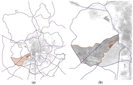Caño Roto in Madrid: (a) “Latina” District in Madrid urban area; (b) Caño Roto settlement, surrounded by “Los Cármenes” neighborhood, at the northeastern end of “Latina” district.