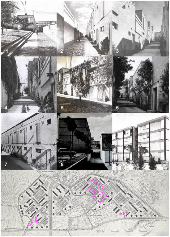 The classic townscape analysis method [35], on the other hand, has been applied by means of chronological comparisons: the same shots published in 1959 [27] and 1964 [33] have been located and photographed nowadays to establish a comparison with the current state and, therefore, to have a critical view on the effect of the passage of time. Since these comparisons are concentrated on exact points, key sequences have been chosen for a comprehensive reading of the urban landscape of the neighborhood, verified in a third fieldwork campaign. This set of “serial visions” [30] (p. 17) is the foundation of this part of the analysis and makes it possible to understand at the same point of the investigation several angles of vision, from inside to outside or from the general to the detail.