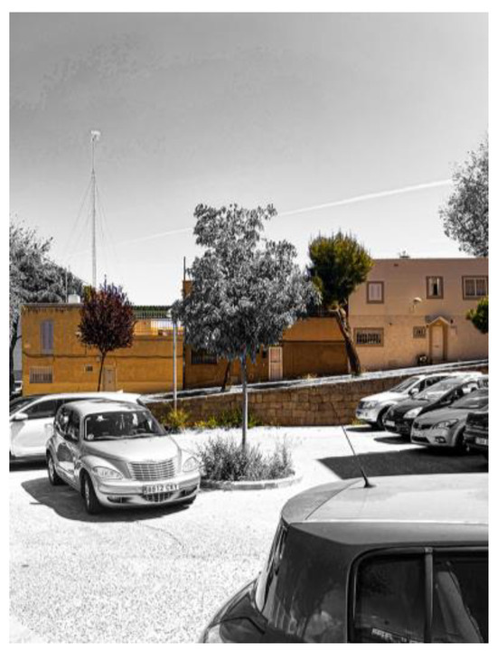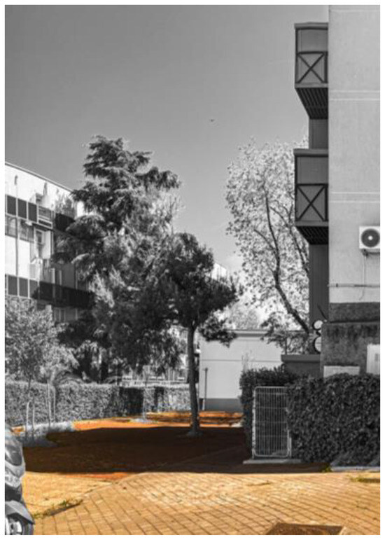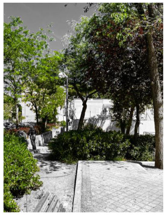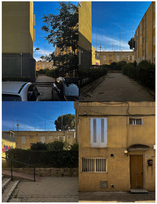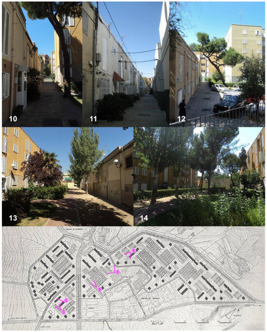 - Case 4 (Figure 10): In the Caño Roto urban project, public spaces constitute a structuring element. Unfortunately, part of the vegetation has been disappearing due to the lack of community involvement in its conservation; meanwhile, the pavement has been modified without a solid criterion. The initial image of the public space, designed “linked to a living tradition” [38] (p. 35) to evoke the squares and small squares of the rural world, has been transformed. In this sense, the original urban design fulfilled a social purpose, as opposed to the current environment, where streets and meeting spaces have been deserted. The passage of time has thus deprived the neighborhood of its maximum identity, the social life for which it was conceived.