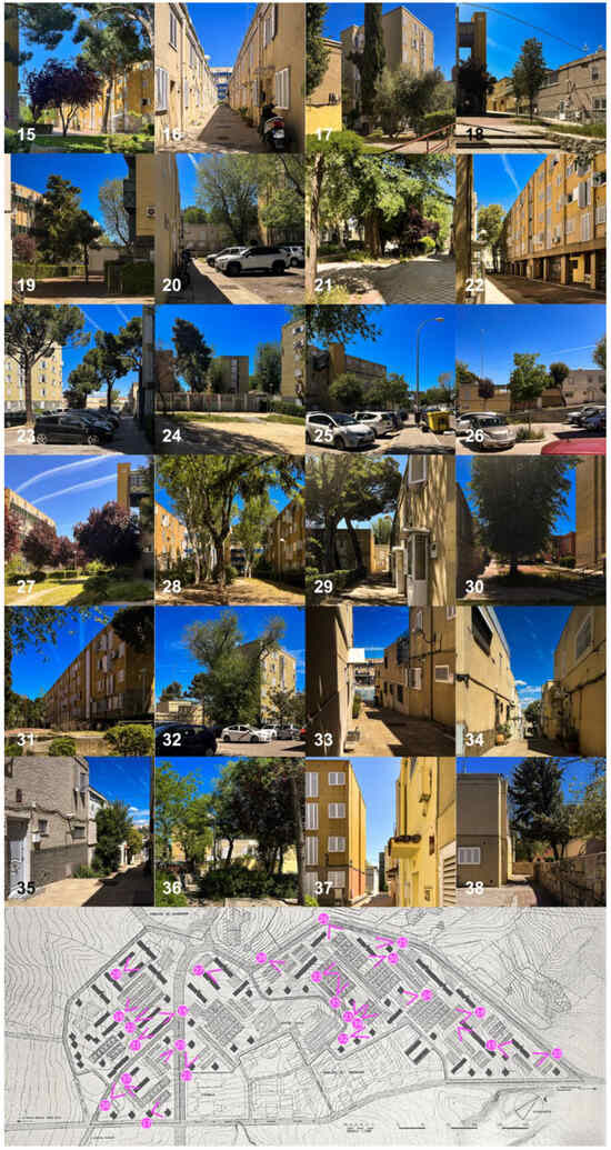 On the plan of the original project are shown the frames of the three photographic series corresponding to the reports carried out in 1959 and 1964—photographs 1 to 9 (Figure 4)—to different shots taken between 2010 and 2013—photographs 10 to 14 (Figure 5)—and, finally, to the field survey of 2023—photographs 15 to 38 (Figure 6). These series have founded different conceptual analyses of the urban landscape of Caño Roto.