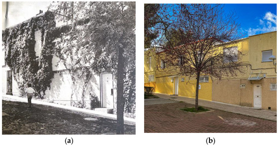 - Case 1 (Figure 7): The passage of time is shown in the modifications of the buildings, proof that the peasant population that first inhabited the settlement did not share the intentions of its architects: “modernity within a certain order and ambience seeking the seal of the moment” [22] (p. 15). The original rationalist elements are still perceived, although their owners have replaced windows, doors, and details with traditional or even folkloric forms. It is evident that those young architects were influenced by the new European post-war avant-garde, especially the Italian [36]. Those simple and economical forms, however, were replaced by more complex geometries or topical elements, such as paneled doors or vaguely Mediterranean shutters. On the other hand, the exposed brick was replaced by a single-layer plaster due to the insufficient thermal insulation provided by the poor original construction. In the renovation carried out between 1996 and 1997, the vegetation on the façade, which had played a fundamental role in the way of life along the thresholds of the dwellings, also disappeared. At the same time were also eliminated the strips of topsoil next to the basement of the single-family houses, which favored the growth of vegetation and helped increase the coolness of the streets and buildings in the summer months.