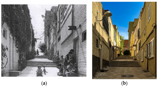 Figure 10. Pedestrian sloped streets: (a) original state, 1964 [33]; (b) current state, 2023.