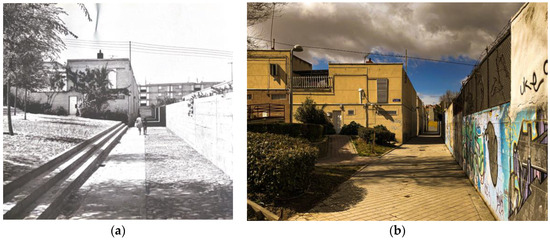 After 1959, “Plan de Estabilización” (Stabilization Economic Plan), supported by U.S. credits, Spain entered the new age called “desarrollismo”, a phase of economic growth that lasted until the 1973 oil crisis, almost in coincidence with the death of General Franco in 1975. During those years, Caño Roto was slowly transformed: with the newly constructed buildings, pending payments, and family survival—apart from some bureaucratic obstacles—the houses did not undergo significant changes. While the vegetation grew, the public space was consolidated, and social life was carried out in an intense sense of belonging to the neighborhood [23]. The organization of the urban fabric, dominated by pedestrian areas, favored casual encounters in a comfortable environment: “in Caño Roto, children can still play in the street” [20] (p. 159). Beyond the misery of its inhabitants or, already in the democratic transition, the problems of citizen insecurity derived from drug trafficking and consumption, the urban landscape projected at the end of the 1950s matured over thirty years into a coherent and singular complex that combines rural nostalgia and its articulation in the growing urban structure of Madrid.