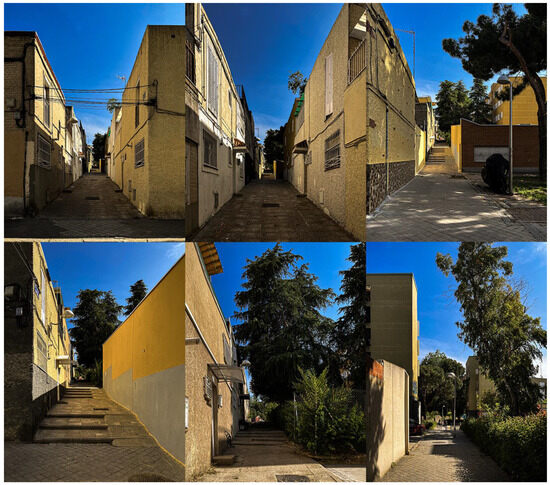 - Case 5 (Figure 11): Social changes and increased comfort standards have justified the necessary transformation of the building fabric and urban design of Caño Roto. Some stairs in the pedestrian streets have been replaced by ramps to provide universal accessibility, and the vegetation has been replanted to avoid allergies or pests, but the original urban layout remains responsive to the topography and the social context. At the crossroads between the road and the transversal pedestrian streets, the widest meeting spaces appear, like rural Castilian “plazuelas” (small squares). Thus, in the diachronic comparison, it can be seen how this dialogue is preserved, and the void and the buildings continue to form a united whole despite the changes in materials and construction details.