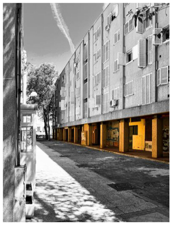 - Walls: The textures of the walls emphasize the prominence of the building masses but, at the same time, do not camouflage the rhythm of their load-bearing structure. Unfortunately, the original light brick walls of the row houses have been lost; however, in some blocks, the capacity of these elements to configure the urban landscape is still visible (Figure 16).