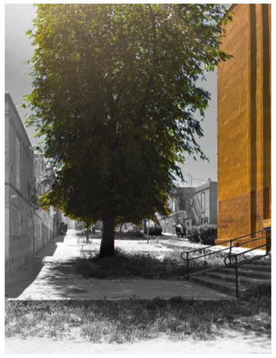 - Intimacy: Although the exterior brick blocks are left out of the scene, we can see how the vegetation forms a ring of protection for the neighborhood: that sense of life and intimacy that still allows us to perceive “a bright and blooming human vigour” [30] (p. 69) (Figure 20).