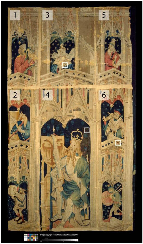 - Rorimer, J.J.; Freeman, M.B. The Nine Heroes Tapestries at the Cloisters; Metropolitan Museum of Art: New York, NY, USA, 1960. [Google Scholar]