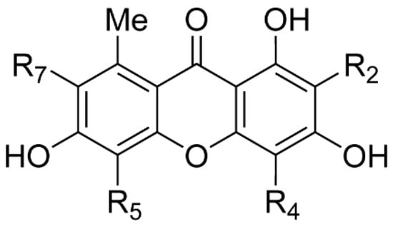 - Le Pogam, P.; Boustie, J. Xanthones of Lichen Source: A 2016 Update. Molecules 2016, 21, 294. [Google Scholar] [CrossRef] [PubMed]