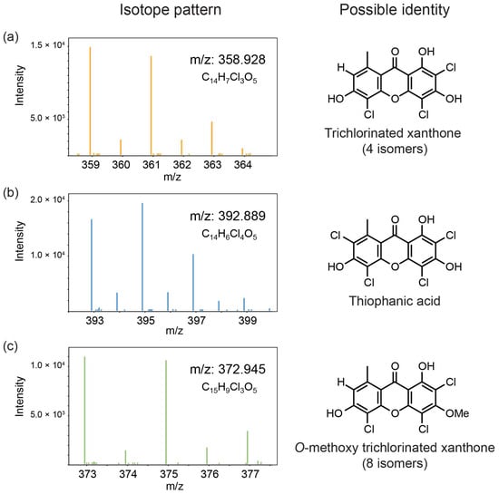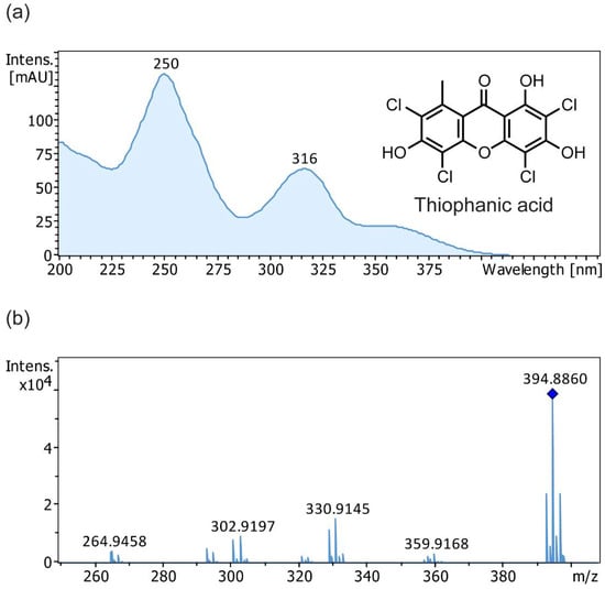 | 17 | 2,4,5,7-tetrachloronorlichexanthone (thiophanic acid) | 25.8 | 392.89 | 360, 329, 321, 301, 293, 264 303, 265, 149 | 200, 250, 316, 355 (sh) | + | + | + | + |