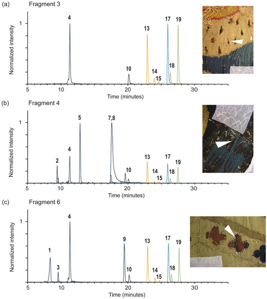 - Witkowski, B.; Ganeczko, M.; Hryszko, H.; Stachurska, M.; Gierczak, T.; Biesaga, M. Identification of Orcein and Selected Natural Dyes in 14th and 15th Century Liturgical Paraments with High-Performance Liquid Chromatography Coupled to the Electrospray Ionization Tandem Mass Spectrometry (HPLC-ESI/MS/MS). Microchem. J. 2017, 133, 370–379. [Google Scholar] [CrossRef]
