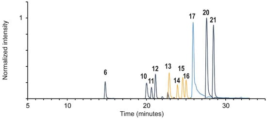 | 15 | 2,5,7-trichloronorlichexanthone (isoarthothelin) | 24.5 | 358.929 | 324, 295, 267, 181, 163.0 137.1 | 201, 250, 315, 350 (sh) | t | t | t | + |
