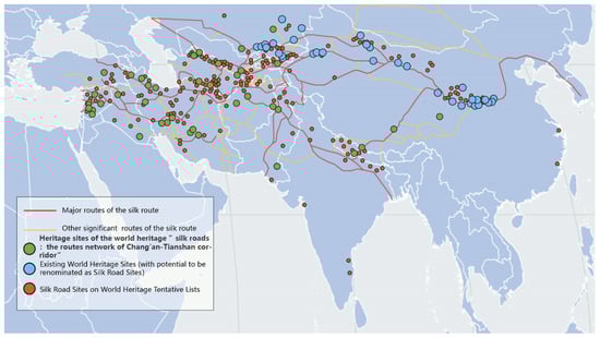 Silk Road and heritage locations for World Heritage. Source: [30] and “https://www.silkroadfutures.net/silk-road-world-heritage-page (accessed on 21 July 2023)”.