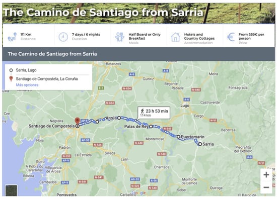 Map of the Camino de Santiago from Sarria and tourism services. Source: “https://santiagoways.com/en/camino-de-santiago-routes/camino-frances/the-way-of-saint-james-from-sarria/ (accessed on 20 July 2023)”.