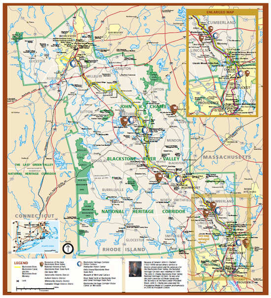 The Blackstone River Valley heritage corridor and tourism regions. Source: “https://blackstoneheritagecorridor.org/exploring-the-blackstone-river-valley/maps-tours-guides/ (22 July 2023)”.