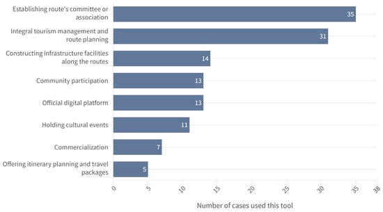 After a systematic literature analysis, we summarized eight types of tools for the tourism development of the cultural routes mentioned in 61 references (Figure 8). In almost all case studies (n = 35), route committees or associations were considered by researchers to be a tool bring together socioeconomic and cultural actors and agents interested in and affecting the governance and dynamics of the route to design a more rational tourism plan. It has particularly come into discussion for routes that cross different countries or regions (e.g., the Danube region [37] crosses 14 countries in Europe, and the Silk Road crosses 33 countries in Europe and Asia [25]) that involve a wide range of stakeholders (e.g., the preservation of the Way of St. James involves residents, church clergy, city planners, tourists, tourism industry players, etc. [38]).