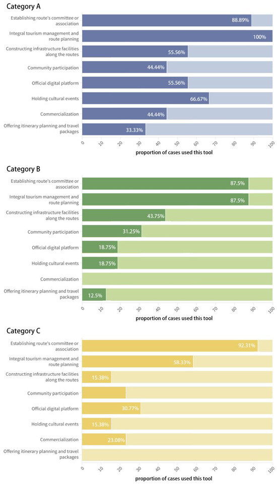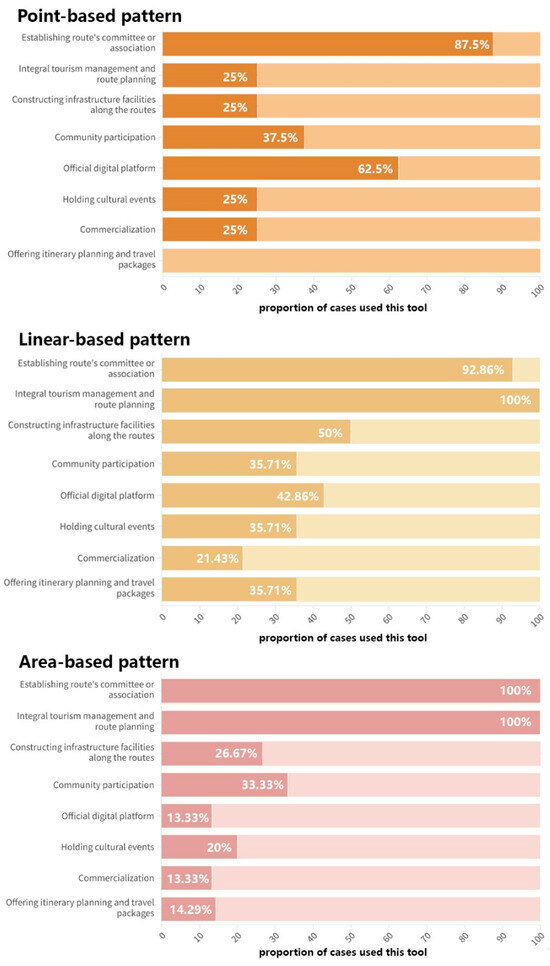 From the analysis of the information gathered, it is clear that there are some disparities in the frequency of usage of these eight tools for the different types of cultural routes and different planning patterns for route tourism (Figure 9 and Figure 10).