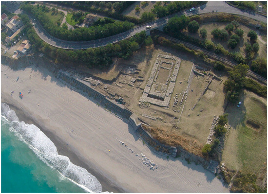 The definitive identification of the ancient Achaean city of Caulonia is due to Paolo Orsi, who, in excavation campaigns from 1912 to 1915, brought to light the remains of the Doric temple and remnants of the city walls [33]. In 1959, Schmidt and Chevallier used Orsi’s aerial photographs and archaeological data to study the topography and town planning of the city. In the 1970s, research activities continued under Alfonso De Franciscis, and more intensively in the 1980s, with the start of programmatic and systematic research on the archaeological site on behalf of the Archaeological Superintendency of Calabria with the contribution of Calabrian universities, the French National Council of Research (CNRS), the Ecole Francaise, and L’Ecole Belgique in Rome [34]. Since 2003, archaeological investigations have focused almost exclusively on the city’s seafront by the University of Florence, and numerous artefacts have been found. In recent years, various structures and objects pertaining to the ancient city have been found in the archaeological area, especially from the excavations at the Doric Temple and from the excavation of Casamatta, where in 2012, an extraordinary mosaic was discovered near a monumental thermal environment dating back to the 4th century BCE. That is considered the largest and most articulated Hellenistic mosaic of the entire Magna Graecia (Figure 3), as well as the oldest in Calabria, dating back to between the end of the fourth and the first decades of the 3rd century BCE [35,36].