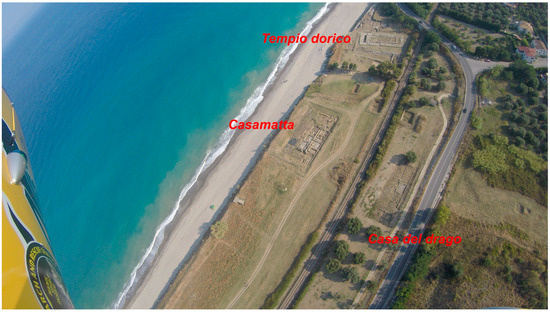 Aerial view of the archaeological area of Caulonia, with the archaeological remains of the Doric temple of Punta Stilo, the remains of Casamatta, and the remains of the Dragon House. On the aerial photograph, archaeological remains are identified by their designation.