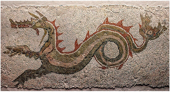 The archaeological area includes the sanctuary of Punta Stilo consisting of a Doric temple dating from around the mid-5th century BCE (Figure 1); the Casamatta, where several coins of the period were found, as well as traces of a cult to Demeter; the House of the Dragon (Figure 2), which includes the remains of a house in which a floor mosaic representing a sea dragon was found, which has become the symbol of Caulonia itself in recent years (Figure 3); the hill of the Punta Stilo Lighthouse where there are the remains of a temple presumed dedicated either to Poseidon or Apollo, and other houses such as the House of the Grotesque Character, the House of Insula I, House Guarnaccia, and House of Clete [30,31,32].