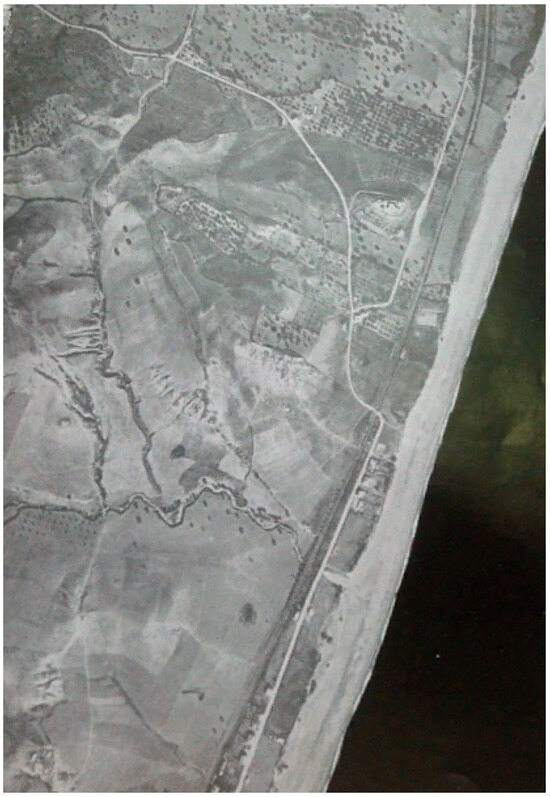 The HLC analysis considered different historical periods using historical aerial photographs from 1938 (Figure 4), which provide important information that is sometimes no longer visible on the ground today due to subsequent transformations, and Google Earth remote sensing images from 2013 to the present day 2024. At the various dates, the key recognisable features of the landscapes were identified through a comparative analysis that demonstrated the changes in land use and land cover, as well as which historical processes or practices led to their formation. The analysis was structured on a georeferenced database and was consequently mappable and analysable through GIS systems. The possibility of interrogating the data in a diachronic series made it possible to analyse the modifications of the territory over time, observing in which directions its landscape and environmental structure is evolving. This, at the same time, made it possible to identify elements of potential landscape risk deriving from the alterations of the agricultural mesh and the expansion of areas with artificial cover, as well as to show in quantitative terms the reciprocal relationship between the different land covers and therefore the balance between the different landscape elements.