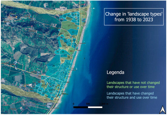 Map of landscape change with variation of landscape types in the period 1938–2024 of the archaeological area of Caulonia. The areas shaded in blue are the landscape types that have changed over the time period in question, changing their landscape structure and use. The areas shaded in green are landscape types that have not changed over the time period in question, while retaining the same function. Author’s elaboration using an HLC database in GIS (with QGis software, version 3.28).