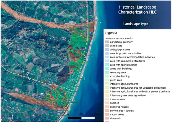 The principle on which the methodology of reading the historical landscape through HLC is based is to verify changes in land use and land cover by identifying minimum landscape units and vocational areas [24]. This is important in order to monitor future transformations of the landscape and assess the related landscape risk so that preventive actions can be implemented if necessary.