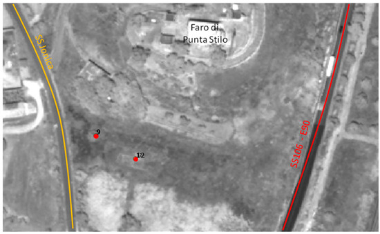 - The track (geolocalised with the coordinates 38°26′40.34″ N–16°34′25.50″ E.), which is darker in colour than the surrounding terrain, is quadrangular in shape, and delimits on the ground a structure with several rooms. It is located in the Carella locality, and appears on the photolithography and photointerpretation of the remote sensing images as a trace with a regular shape, consisting of a series of rooms that link together to create a structure that could be pertinent to a large building. The survey carried out in the area under examination did not yield any significant information, and to date it is not possible to define the origin of the track identified on the remote sensing images (Figure 7).