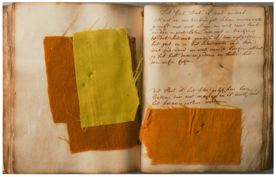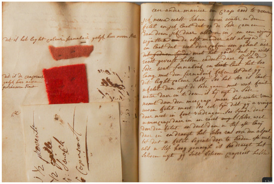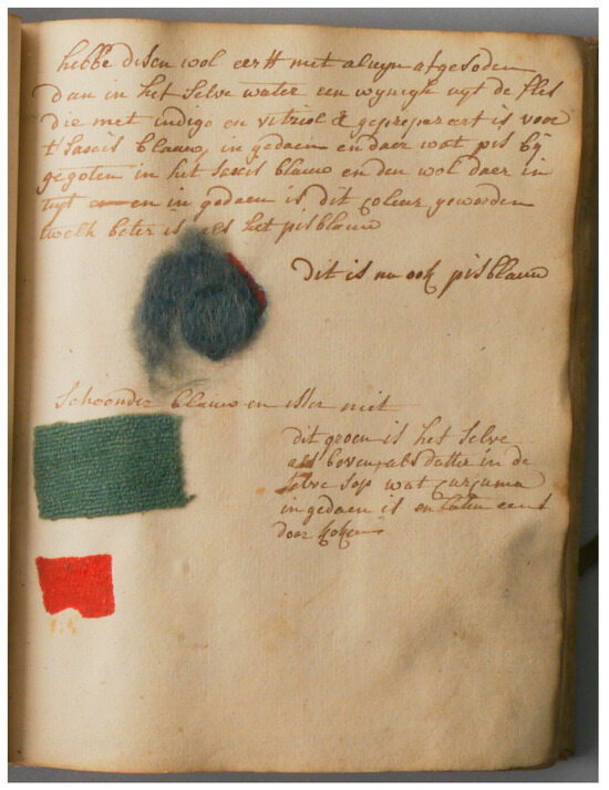 To conclude, this 18th-century Flemish dyer’s manuscript from Antwerp is a rare and relevant finding in the study of textile-bound practices. This unique artifact contains valuable first-hand insights not only into the dyeing procedures, but also into the accounting practices, and relations with customers. Directly, and indirectly, through our analysis, we were able to develop insights into the socio-historical context and the daily practices of the dyer, and further understand the development of knowledge across the 25 years covered by the manuscript. Lastly, the presence of more than 100 colored samples even further enriches the manuscript, granting tangible proof of the dyer’s skill and providing a reference as to how materials like cochineal, madder, brazilwood, redwood, indigo, and other dyestuffs were utilized. These processes were then translated into products for the customers of the enterprise, which, through analysis, we were able to identify as a broad middle class.