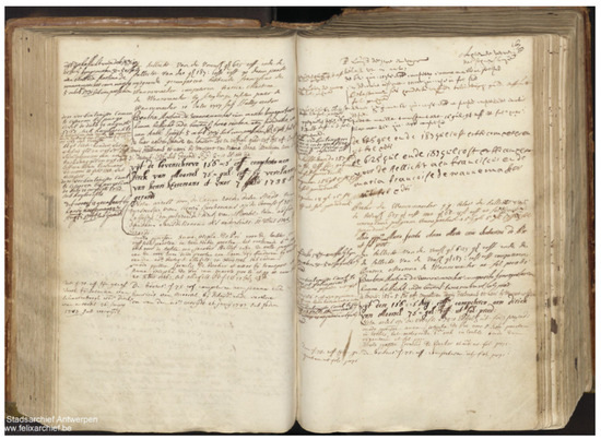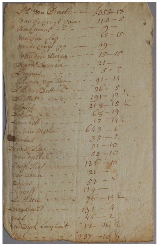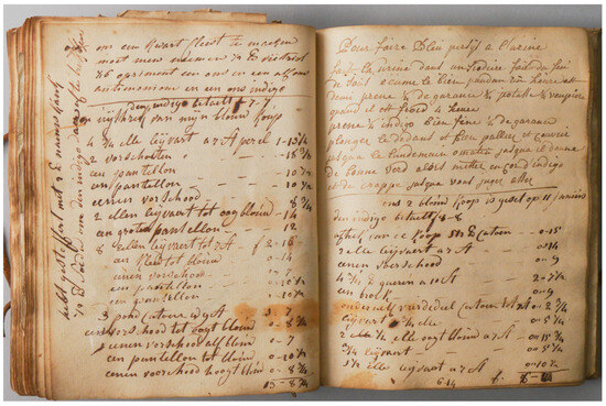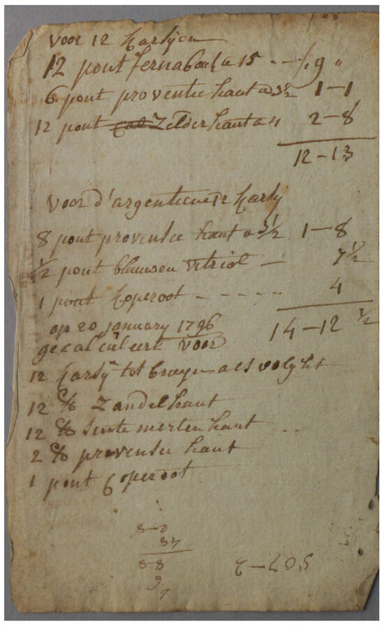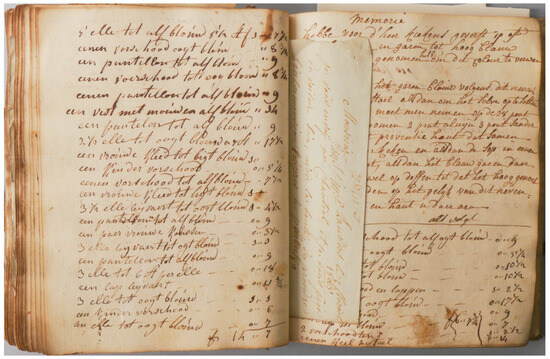 Another indicative measure of the scale of the enterprise was deduced through a comparison with the Crutchley Archive’s cashbook, which mirrors similar accounts to those found in the Antwerp manuscript, including transactions and tabs. The financial records in the Crutchley Archive extend up to GBP 2586 (equivalent to over EUR 345,000 today) for a single order. In contrast, the Antwerp dyer’s accounts (Figure 14) document tabs up to 643 fl. (approximately EUR 5000 based on contemporary currency conversion rates) [28].