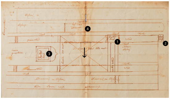 The map contained within the dyer’s manuscript. (1) Tuchthuis (Penal structure), (2) Unnamed property, (3) Hanseatish huis (Hanseatic house), (4) Blommaert’s property.