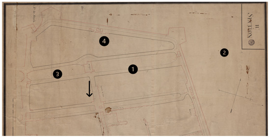 Section 2 of the map of Antwerp in ca.1800. (1) Tuchthuis (Penal structure), (2) Unnamed property, (3) Hanseatish huis (Hanseatic house), (4) Blommaert’s property.
