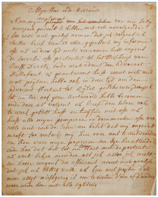 The third section consists of six examples of correspondence between the dyer and the customers (Figure 8). Despite this being the smallest section of the manuscript, these letters offer us interesting and relevant insights into daily matters such as payment requests, deliveries, and legal matters. Finally, it is important to mention the 104 colored fabric samples, which are included in the manuscript and pinned to the recipe they were supposedly produced with. This addition even further increases the rarity and the value of the manuscript, as these well-preserved samples are a direct testament to the practices of the dyer and are a precious reference with which to further study the recipes.