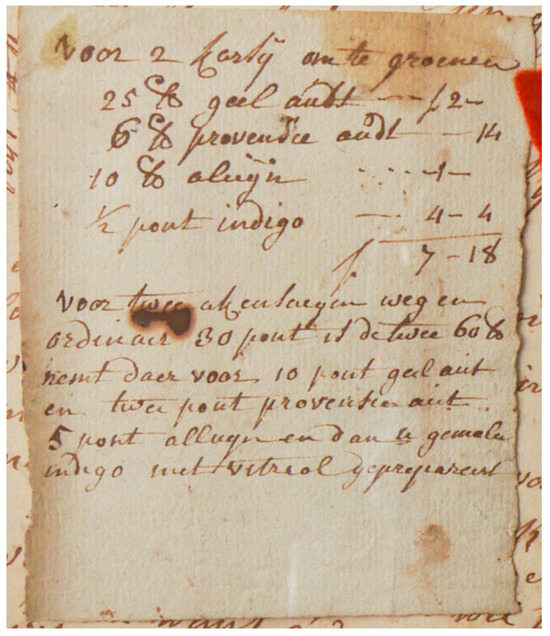 Tracing of the manuscript within the city of Antwerp and ascertaining its timeframe were achieved through archival research. Even though this task proved arduous due to the apparent lack of sources, we were able to retrieve information, and through the elements described in the previous paragraphs, partially reconstruct its context. The dyer was located within the famous dyer’s district of the city, in the key years of the transition from the Austrian–Hapsburgian influence to the French revolutionary and Napoleonic one. These years also correspond with the transition from a period of economic growth to one of economic stagnation and recession. This section of the research could further be developed by delving within the city archives, determining the specific name and owner of the enterprise, and developing that avenue.
