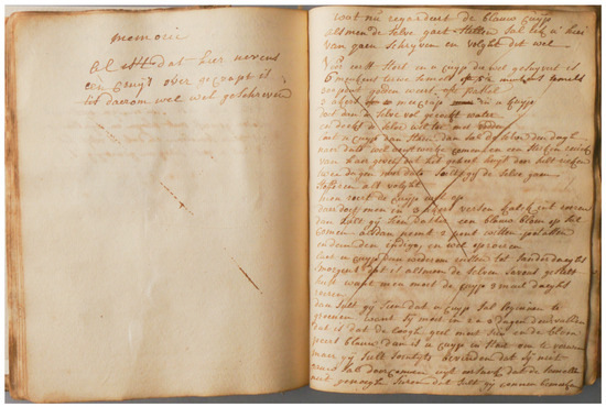Setting up an indigo vat pp. 23–24. Left page: ‘Memoire, Al staat dat hier neven en cruis over gecrapt is t’is daarom wel geschreven’ (Reminder, even if there is a stripe on the next recipe, do not mind that as it is still well written).