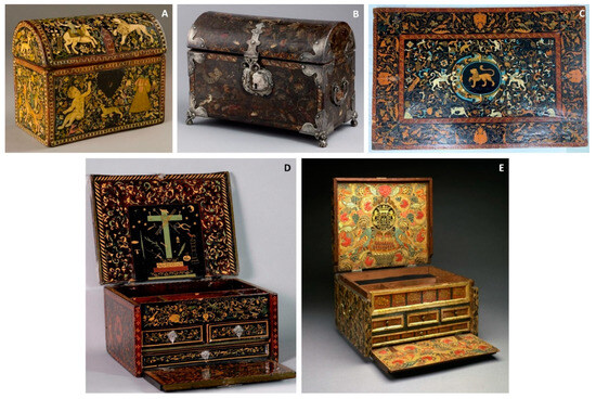 The five artworks were divided into two groups based on their form, relative size, and dating. The first group includes the Casket (LS2361) and the Coffer (LS2067) (Figure 1A,B), similar in terms of structure, size, and date, despite having been made with different decorative techniques. They show the same basic wooden structure with arched interior lid supports and a domed lid. Except for the bottom, which is unfinished, all surfaces, inside and outside, are covered with resin (Figure 2). Within the reddish translucent band that frames each of the exterior panels of the Casket (LS2361), larger figures of a cherub, a Spanish lady and a man on horseback, and animals—deer, lions, dogs—are surrounded by flora and fauna on a black background, and contain the following limited palette: several shades of ocher, pink, pale and dark blue, light green, olive green, and gray. This technique inlays different colored lacquered shapes to create the design or, in the case of the grayish hare, cuts away resin to reveal black detailing (Figure 3).