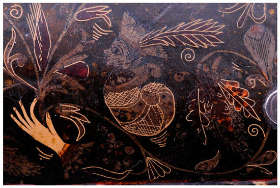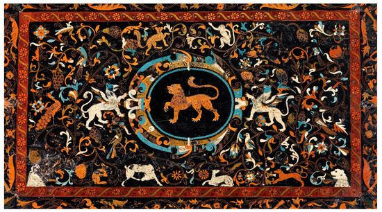 The second group of objects consists of two Escritorios, one decorated with the matte barniz technique (LS2446) and the other decorated with barniz brillante (LS2000) (Figure 1D,E). The matte barniz Escritorio (LS2446) is a fall-front writing box with three drawers decorated with a technique similar to that of the Casket (LS2361), with inlaid colored resin making up the design. The Escritorio has a black and dark-red background with decorative details in blue, green, yellow, red, and black. The inscription just above the drawers identifies the original owner: “CAPSULA H(A)EC EST MARTINI DE TOLOSA” (Figure 6), which means “this box belongs to Martin de Tolosa”. The religious imagery on the inside of the lid contains clues about his occupation: archival research has identified Martin de Tolosa as chief sacristan and chapel master at the Cathedral of Popayán from at least 1630 to 1643. Consequently, the box was given a ca. 1643 date. Amongst the foliate decorations, both European and South American animals are illustrated. These include an amaruca, a dragon from Andean mythology on the back panel, and figures, including possibly a portrait of the box’s owner, Martin de Tolosa [24].