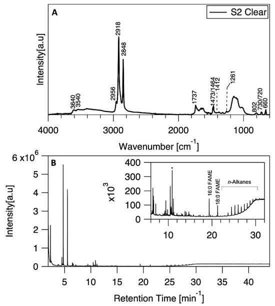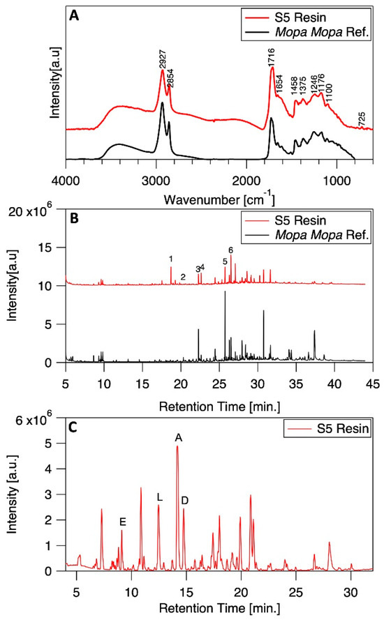 For the identification of the resin, analyses by FTIR, Py-GC/MS, and LC/MS were performed on the resin binder (S5) collected from the surface of the 17th-century Tabletop (LS2447), as well as on reference samples of unprocessed and boiled E. pastoensis, as already described in [22]. The FTIR analysis of sample S5 presents spectral features corresponding to the methylene symmetric (2854 cm−1) and asymmetric (2927 cm−1) stretching modes and a broad OH envelope (Figure 9A, red trace). Additional features associated with aliphatic compounds are present at 1458, 1414, 1375, and 725 cm−1, with the peak at 1414 cm−1 being related to methylene groups adjacent to esters or carboxylic acids. Oxygen-containing moieties are also indicated by a strong spectral feature at 1716 cm−1 (carbonyl stretching), with a shoulder at approximately 1730 cm−1 accompanied by bands at 1246, 1176, and 1100 cm−1. Similar spectral features are identified in the unprocessed mopa mopa reference sample (Figure 9A, black trace), as well as in reported analyses of mopa mopa resin [7,17,19]. Prior FTIR analysis of Colombian [7,22] and Peruvian [17,31] lacquerwares have also identified mopa mopa in a number of objects dated to the colonial era. No resin samples were collected from LS2000 or LS2361, and as such, no insights are possible on the composition of the resin on these objects.